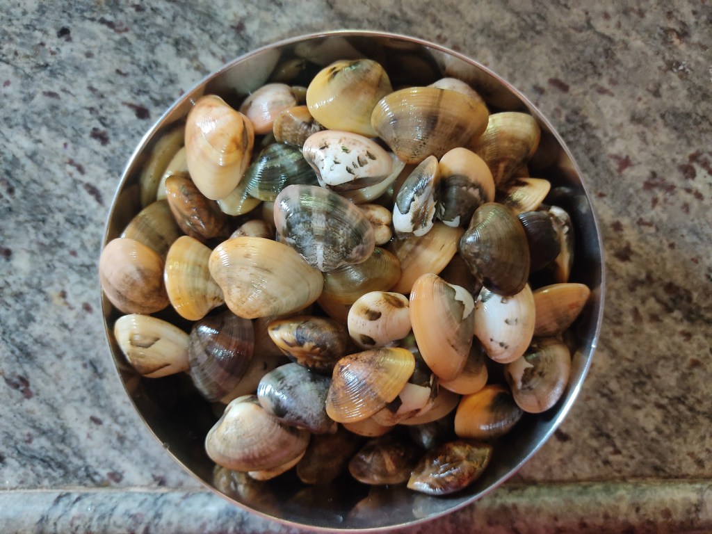 The focus of this recipe is on using fresh clams. As soon you get them from the market, fill water in the tub containing them, and start washing the clams. Pick up the clams, transfer them to another container, and discard the water from the tub. Repeat a similar process 3-4 times or until you completely get rid of the sand. Next, we will use the long blade of the adoli to de-shell each of the clams, slitting the clams in the center, pulling the two halves apart, and retaining the flesh on one shell while discarding the other shell. Once all the clams are de-shelled in this manner, we are good to go!