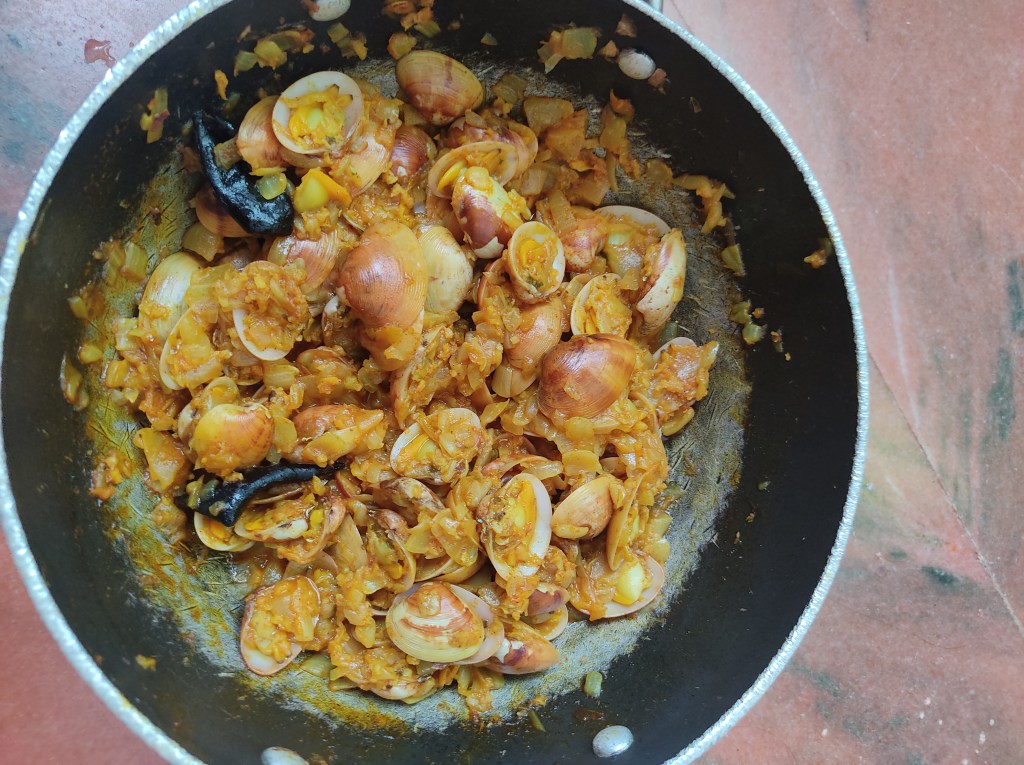 A few weeks back, the fisherwoman who frequents our neighbourhood had brought a batch of the freshest clams from São Jacinto island. We bought some and then went on to prepare some tisryanche sukhe.