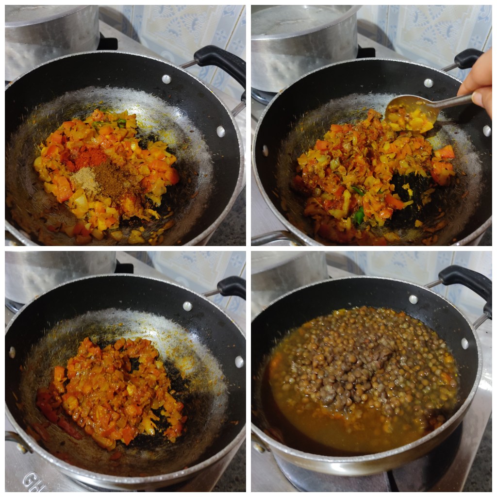 - Add in the cooked masoor dal with a little bit of its water. Add in more water as required.